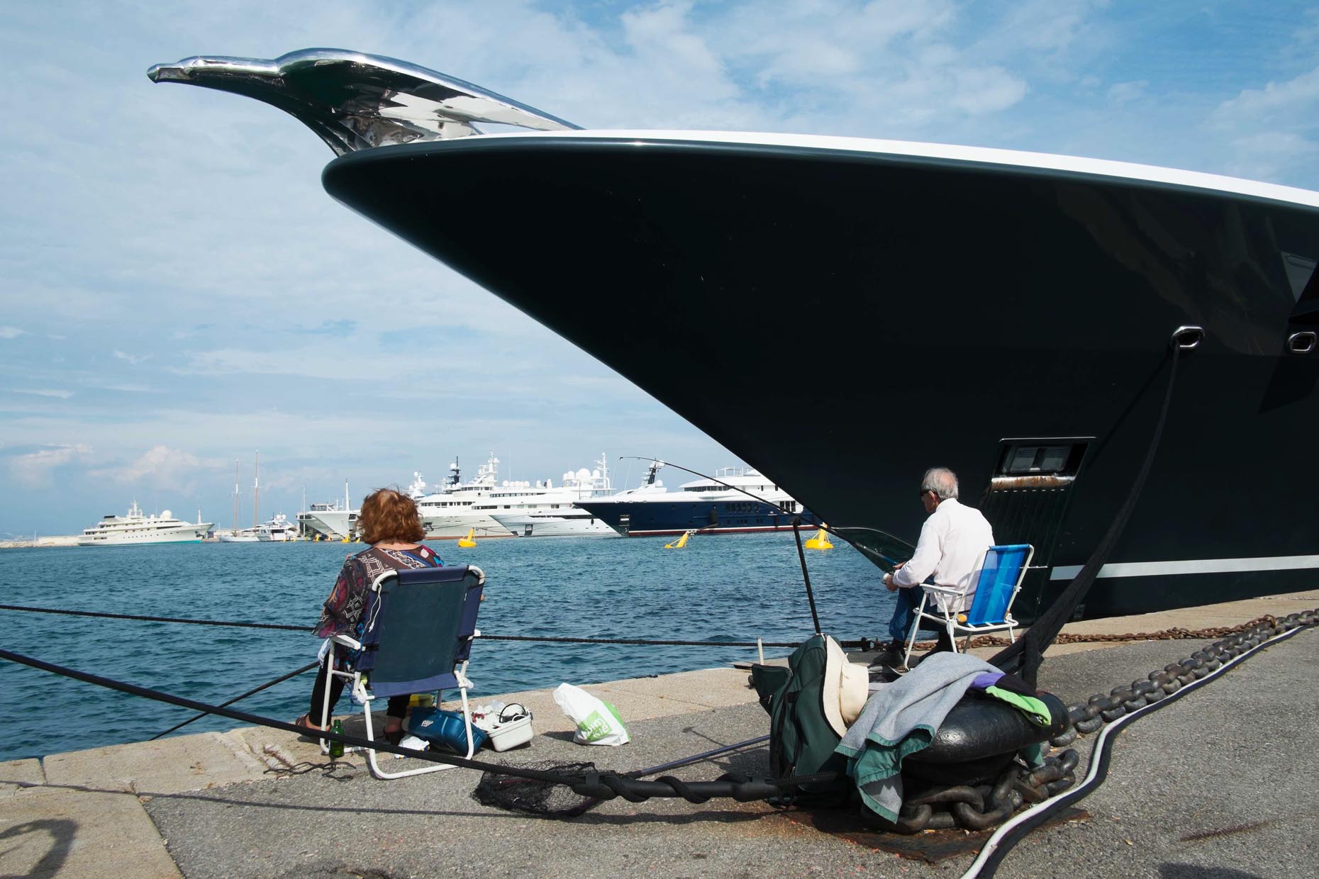 Im Hafen von Antibes liegen die ganz großen Yachten, hier die „Phoenix 2“, die angeblich einem polnischen Dollar-Milliardär gehört. Die Einheimischen Angler lassen sich allerdings nichtmal von der bemerkenswerten Gallionsfigur beeindrucken.